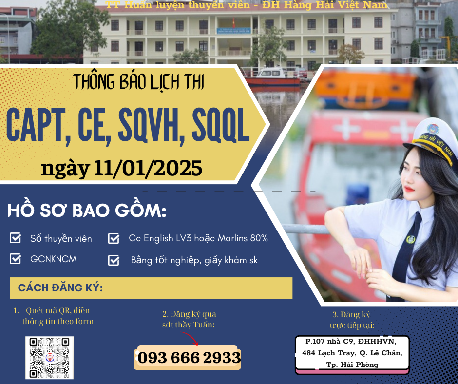 Nhằm giúp các thuyền viên thuận tiện theo dõi và chủ động sắp xếp thời gian, nay TT Huấn luyện Thuyền viên - ĐH Hàng Hải Việt Nam thông báo mở khoá thi Sỹ quan vận hành, Thuyền trưởng, Máy trưởng khoá 01/2025.